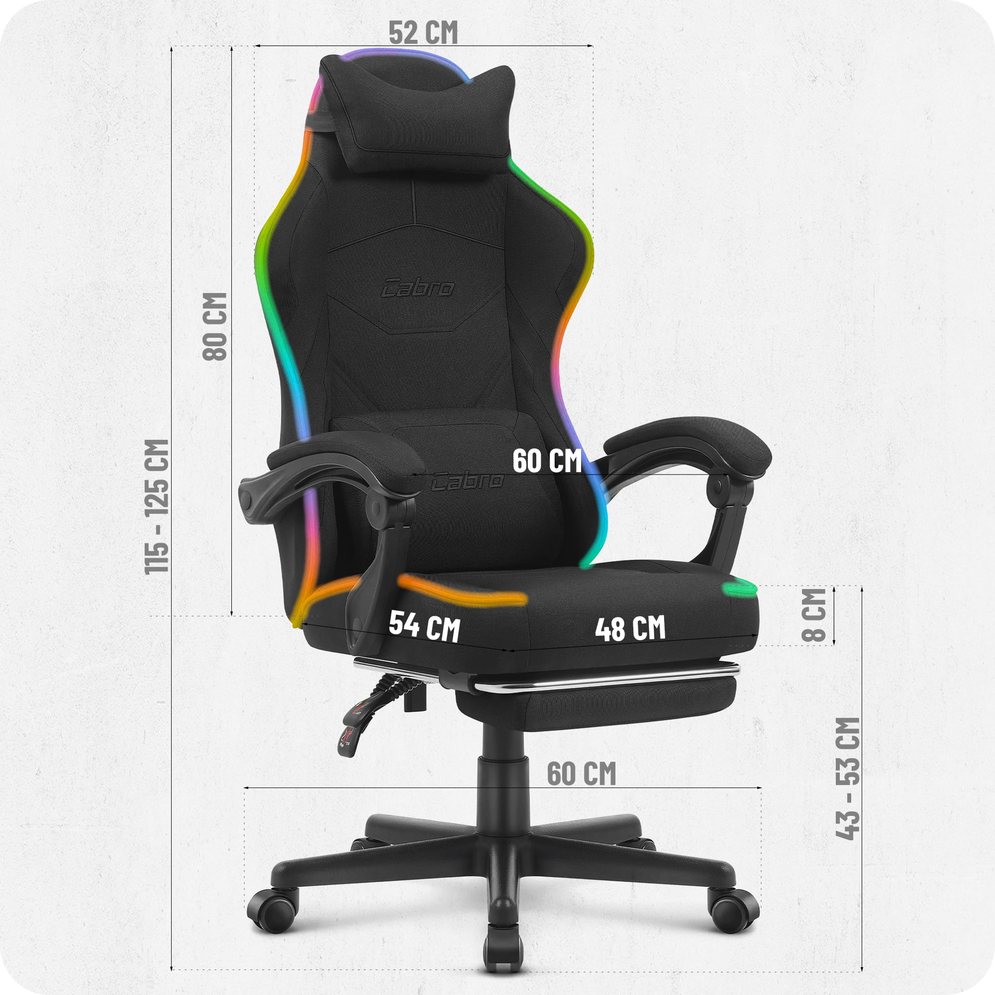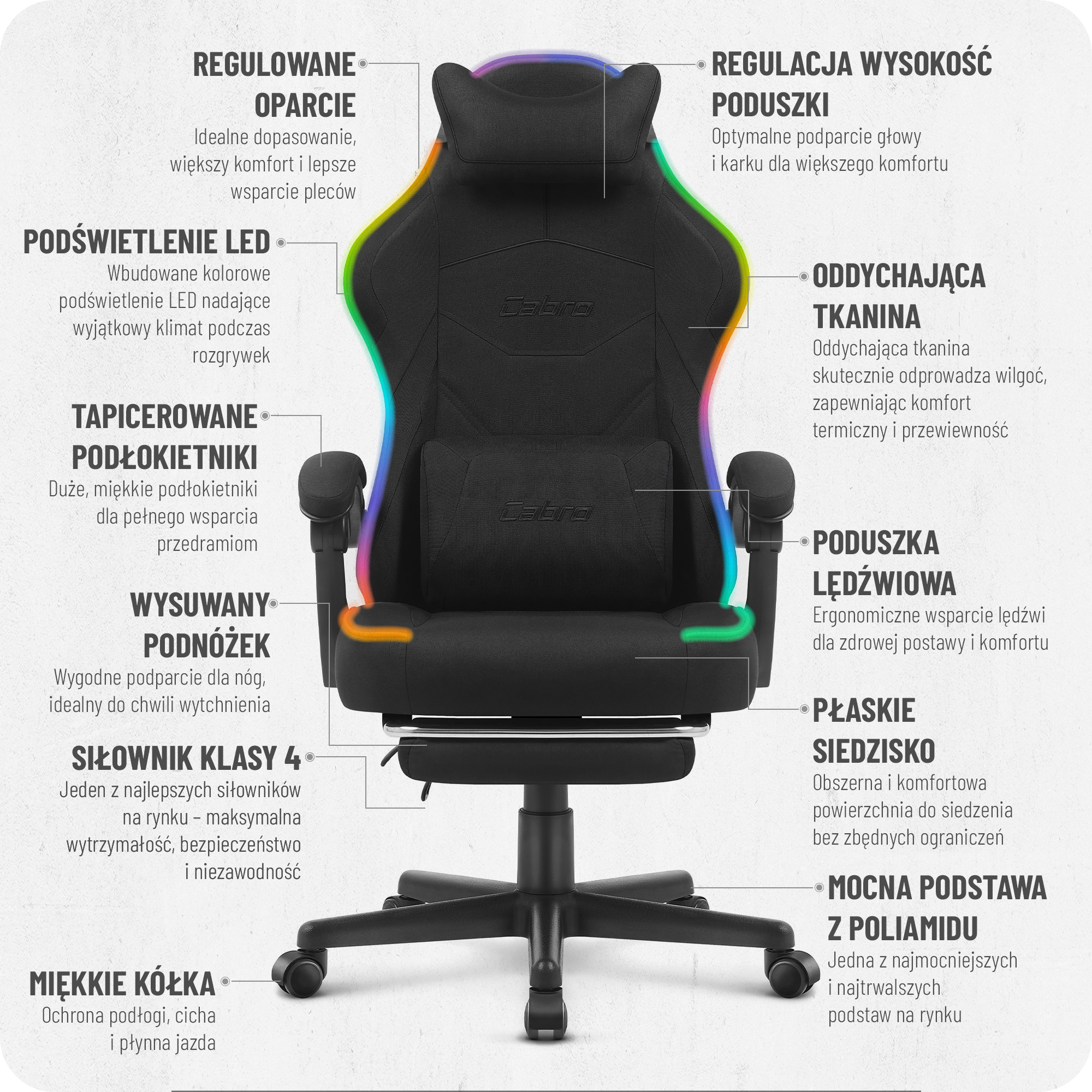 Fotele Cabro C502 zostały zaprojektowane z myślą o graczach, zapewniając idealne wsparcie przez długie godziny intensywnej gry. Dzięki innowacyjnym rozwiązaniom, solidnym materiałom i precyzyjnemu wykonaniu, gwarantujemy niezrównaną wygodę i trwałość, które sprawiają, że nasze fotele to najlepszy wybór.